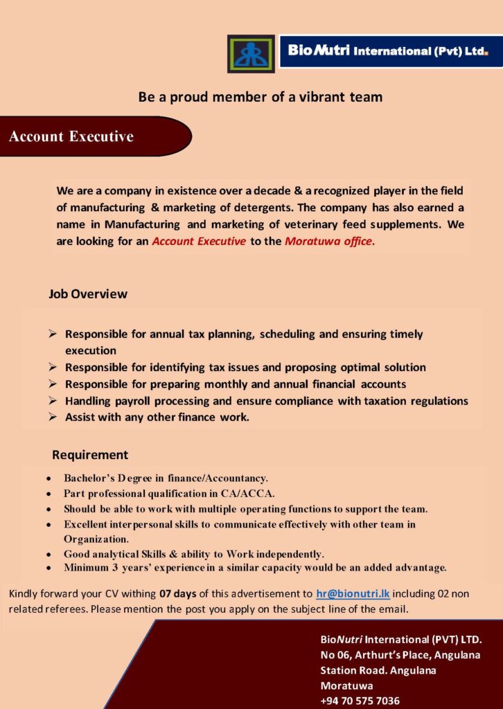 We are a company in existence over a decade & a recognized player in the field of manufacturing & marketing of detergents. The company has also earned a name in Manufacturing and marketing of veterinary feed supplements. We are looking for an Account Executive to the Moratuwa office.
